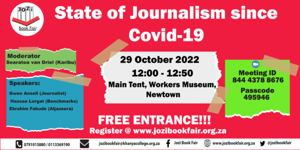 The State of Journalism since Covid-19By Admin / 23/10/2022 State of Journalism since Covid 19: Moderator: Searatoa van Driel (Karibu!) Speakers: Ebrahim Fakude (Aljazeera) Hassan Lorgat(Benchmarks) Gwen Ansell (journalist) Saturday, 29 Oct 2022, 12.00 to 12.50pm, Main Tent, Workers Museum, Newtown